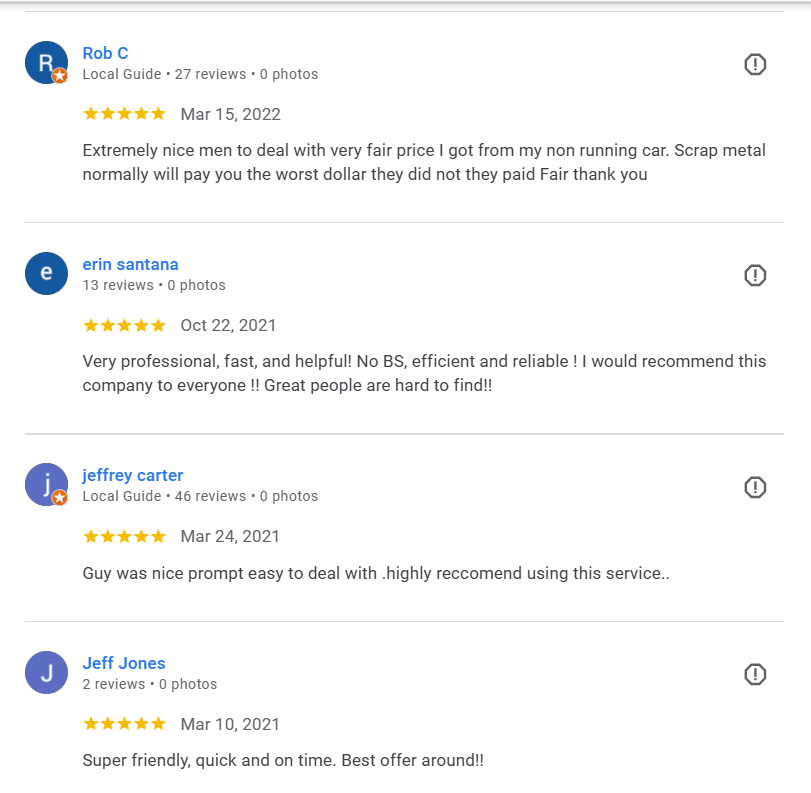 We believe that our customer’s reviews will help you to make an informed decision when you’re looking to sell your vehicles, or when you need cash for travel trailers in Largo or cash for boats in St Petersburg & Pinellas County. If you have questions about selling a vehicle or boat, or to get an offer for your old or unwanted travel trailer, vehicle or boat, reach out to Cash For Junk Cars St Petersburg FL today!
